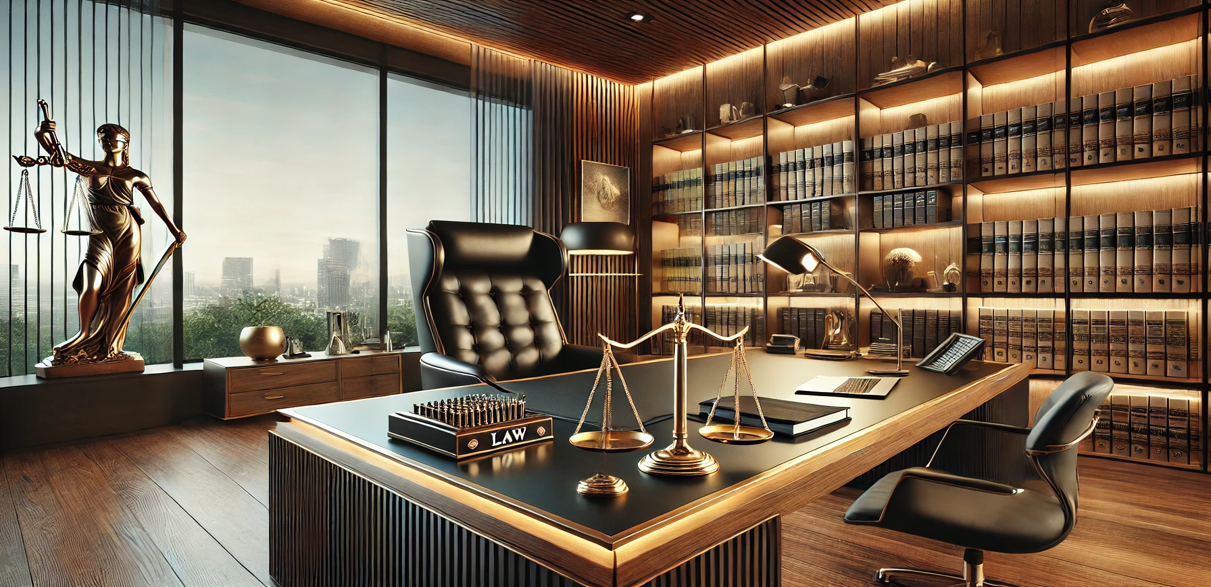Escritório de advocacia imponente com mesa de madeira nobre, balança da justiça em dourado, estantes de livros jurídicos iluminadas e vista panorâmica para a cidade, representando autoridade e confiança.